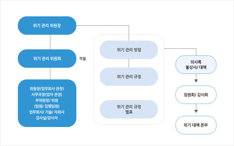 - <위기관리위원회>를 정기적으로 개최하고 있습니다. 또한, 위기가 발생한 경우는 즉시 사장을 본부장으로 하는 <위기대책본부>을 설치하고, 대책을 강구하도록 하고 있습니다.